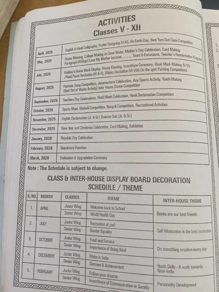 | July | Holiday's Home Work Display, House Meeting, Investiture Ceremony, Book Mark Making (V-VI) Hindi Poem Recitation (IX & X), Shloka Recitation (VI-VIII) On the spot Painting Competition) |